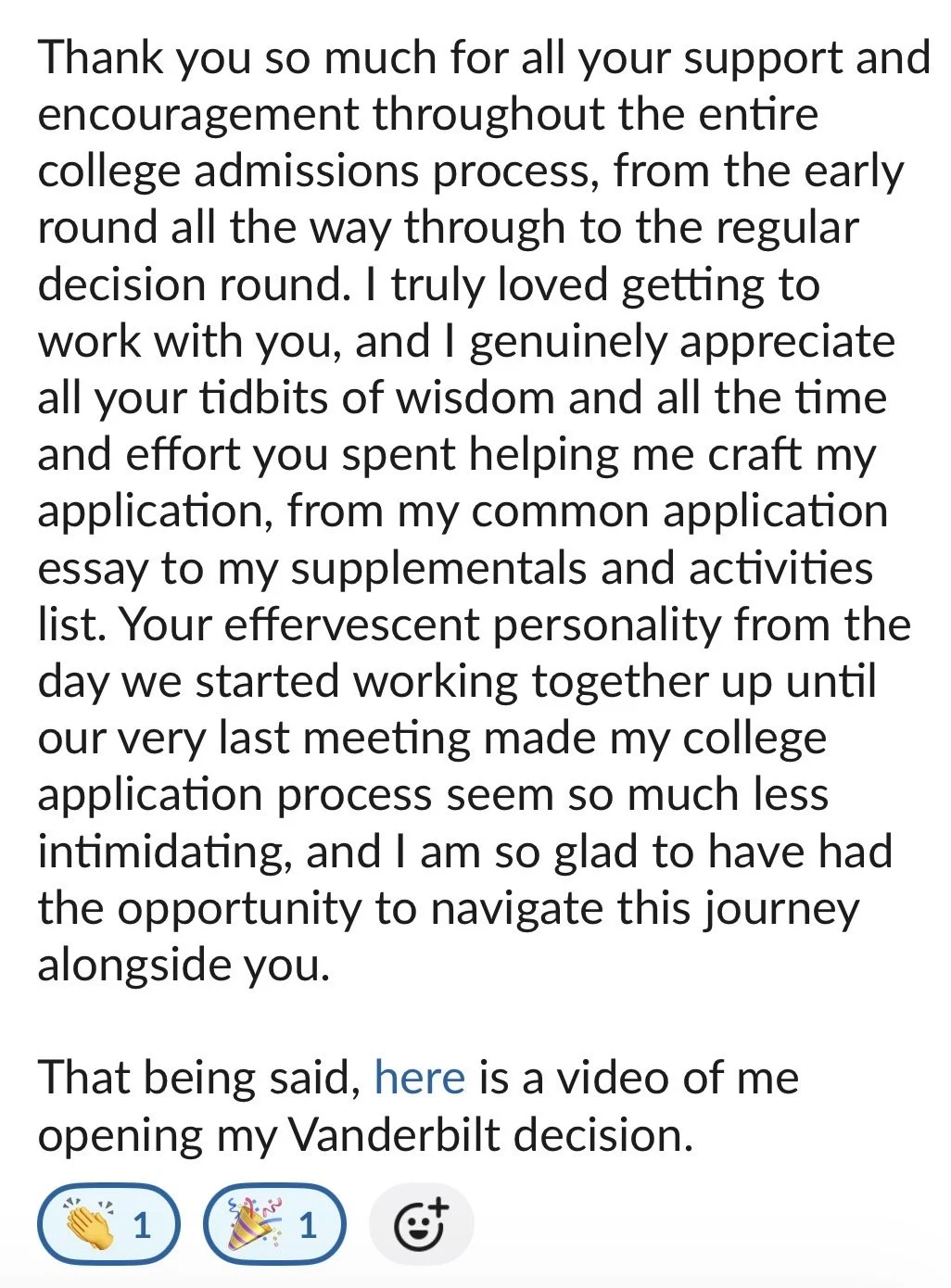 Eight 1:1 sessions, unlimited written feedback, and focused expert support on the personal statement, Common App, and supplementals for three schools — finished before September 1.
